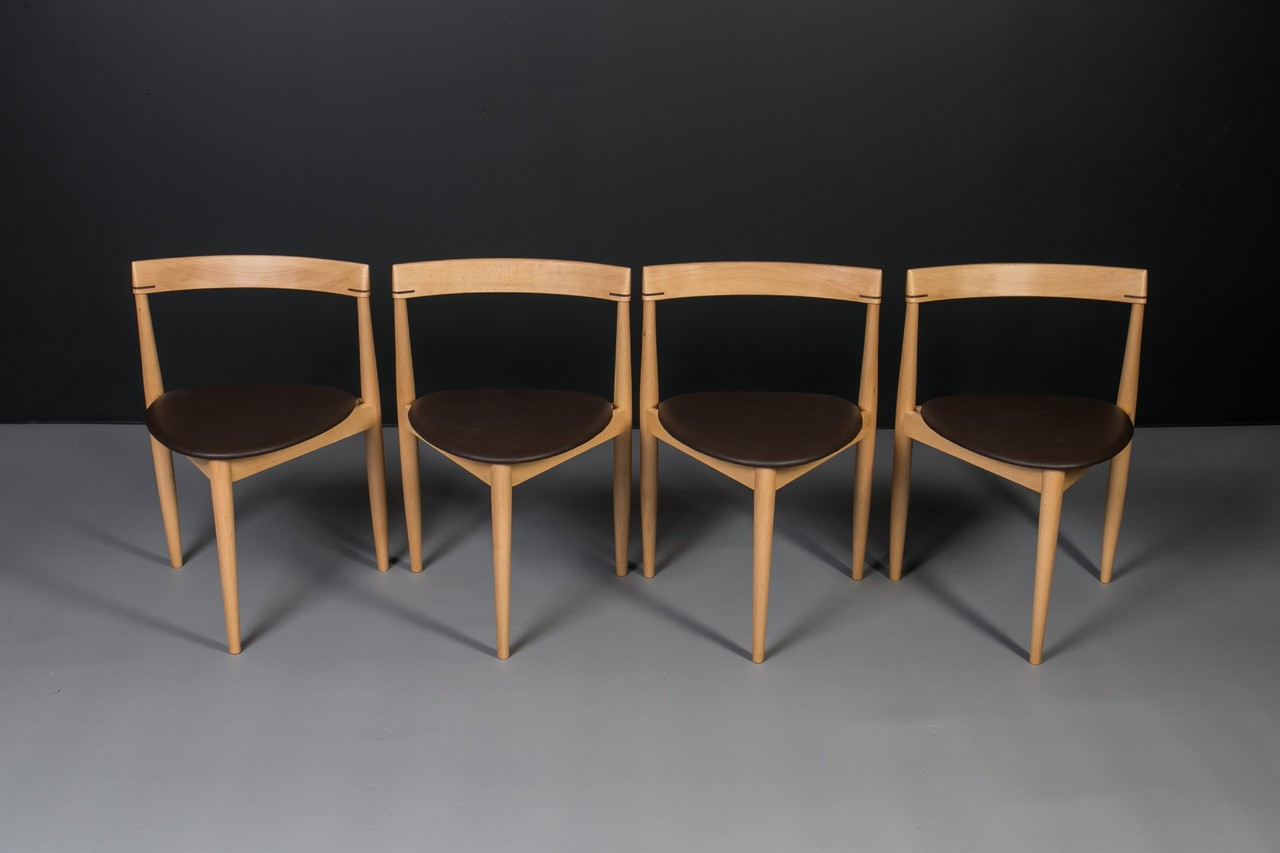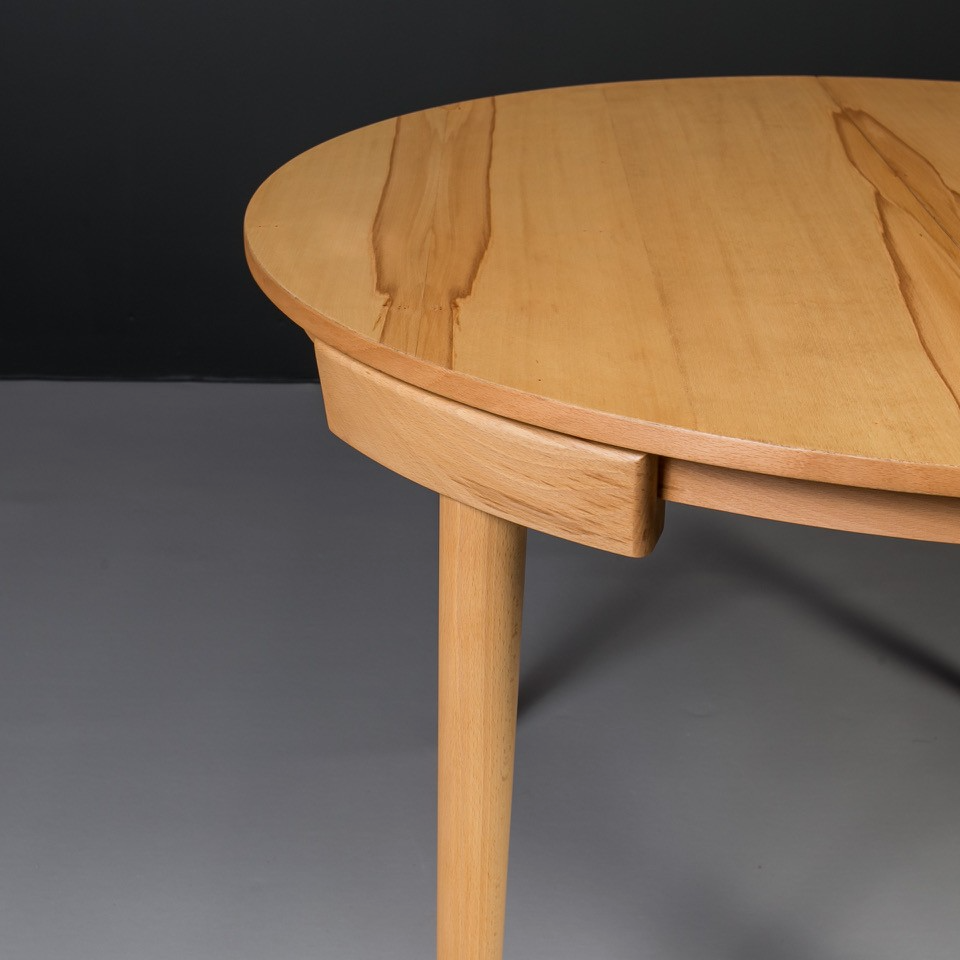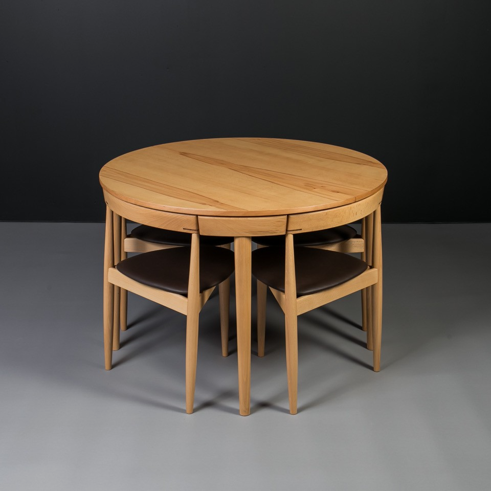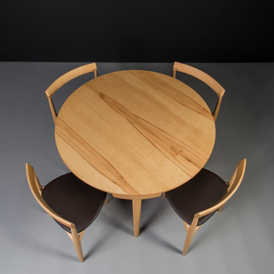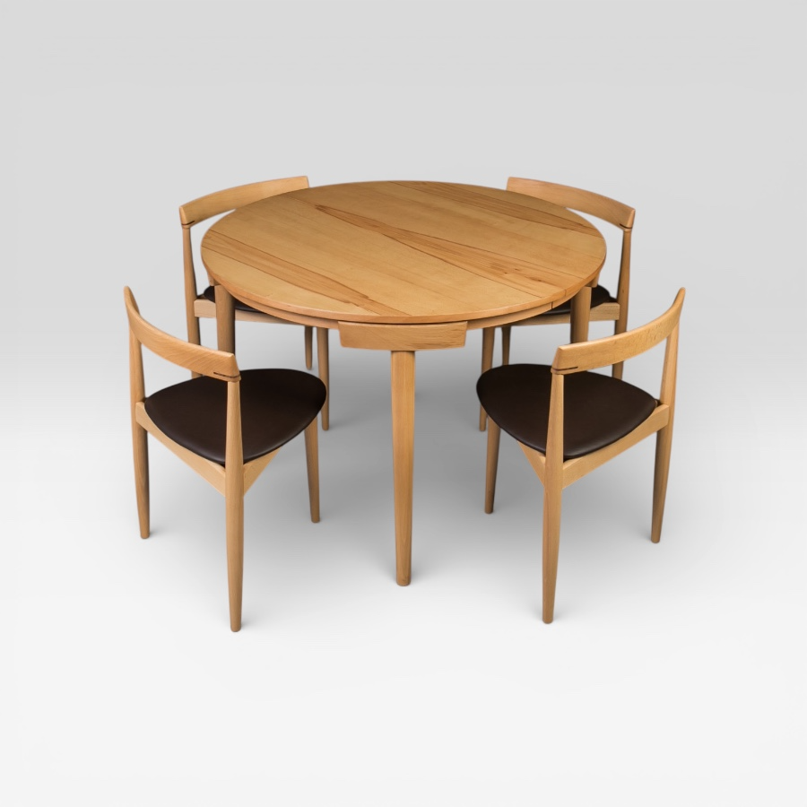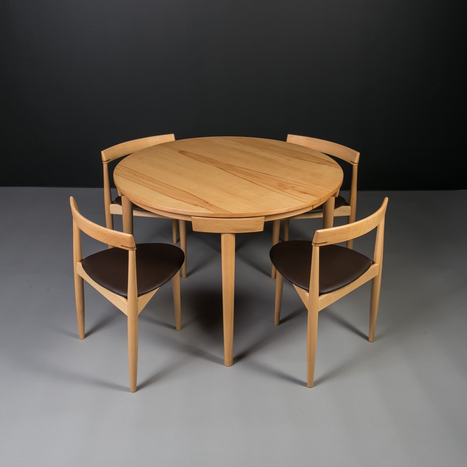 The set includes an extendable round beech wood table and four matching dining chairs with distinctive triangular seats. The chairs seamlessly tuck into the table, with their curved backrests perfectly following its shape, creating a compact and elegant form.