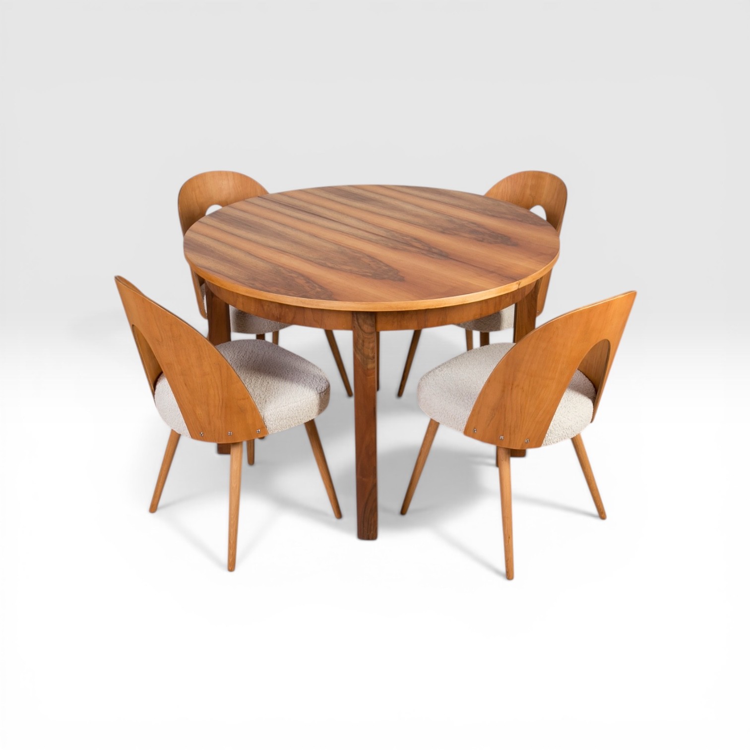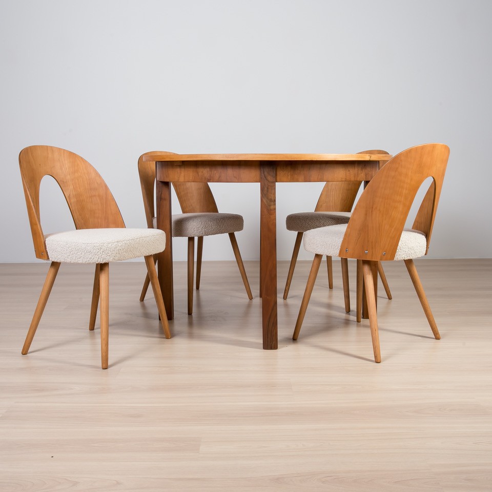 An elegant dining set from the 1960s, consisting of a round extendable table and four chairs designed by Antonín Šuman.