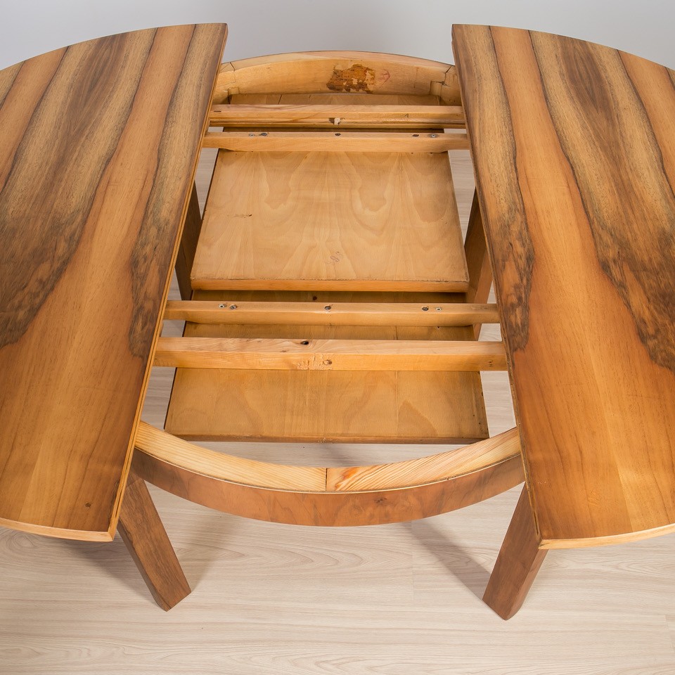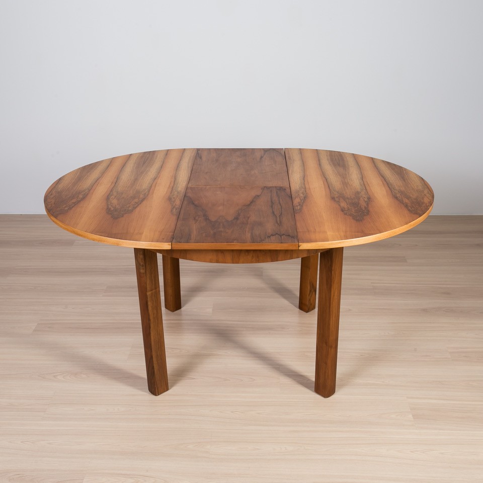 The round table features an extension leaf, offering flexibility for both everyday use and larger gatherings, while maintaining a light and well-balanced form. Its simple construction highlights the quality of craftsmanship and the beauty of the material.