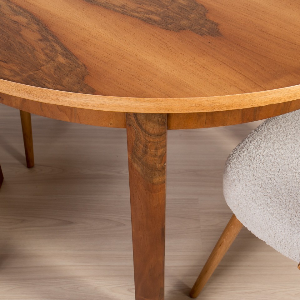 This set is a refined example of mid-century modern design, where clean, soft lines are combined with functionality and timeless elegance. Crafted in walnut, it stands out for its warm tone and calm, natural grain.