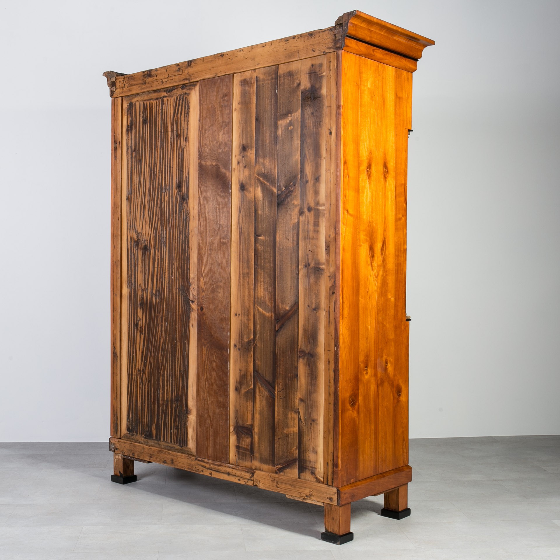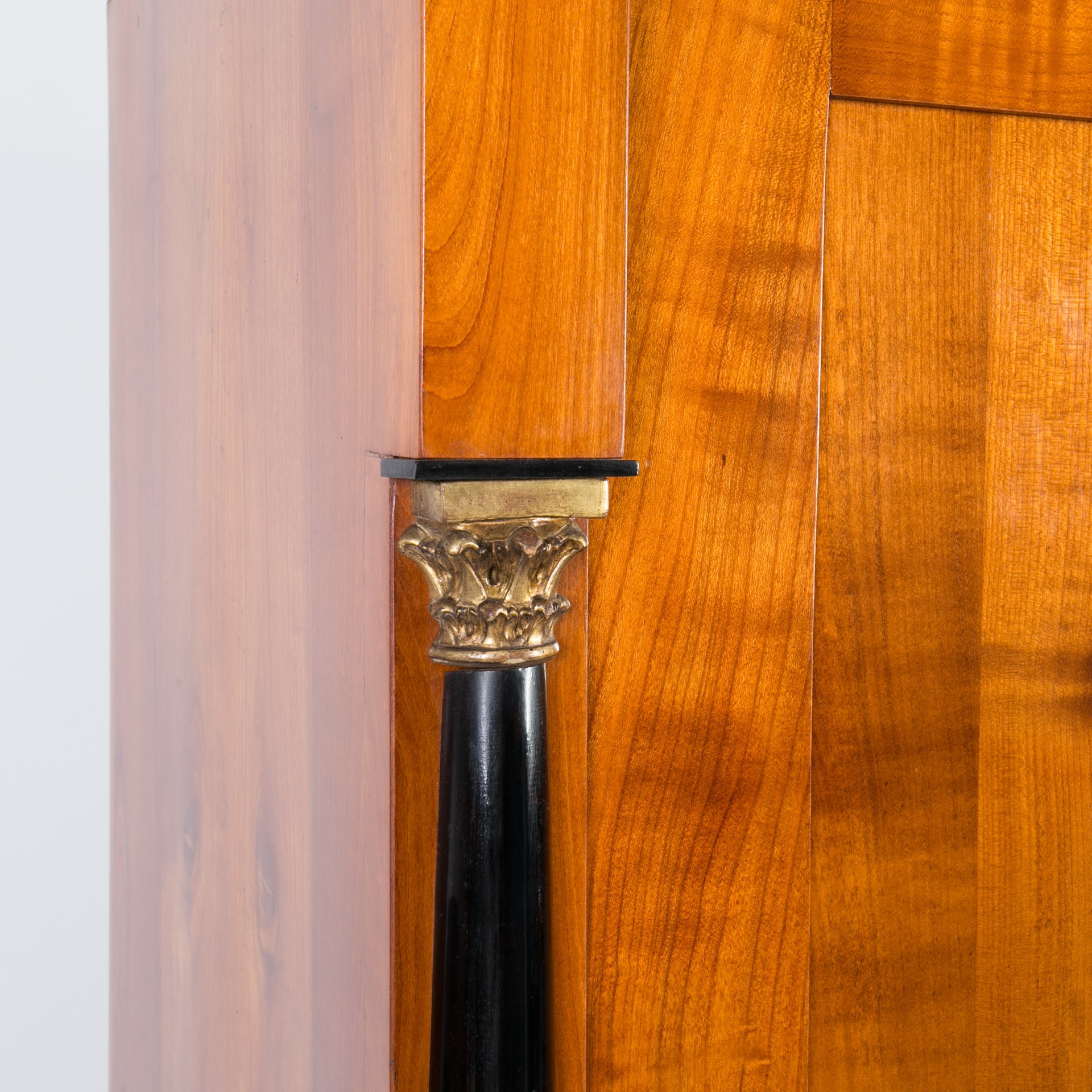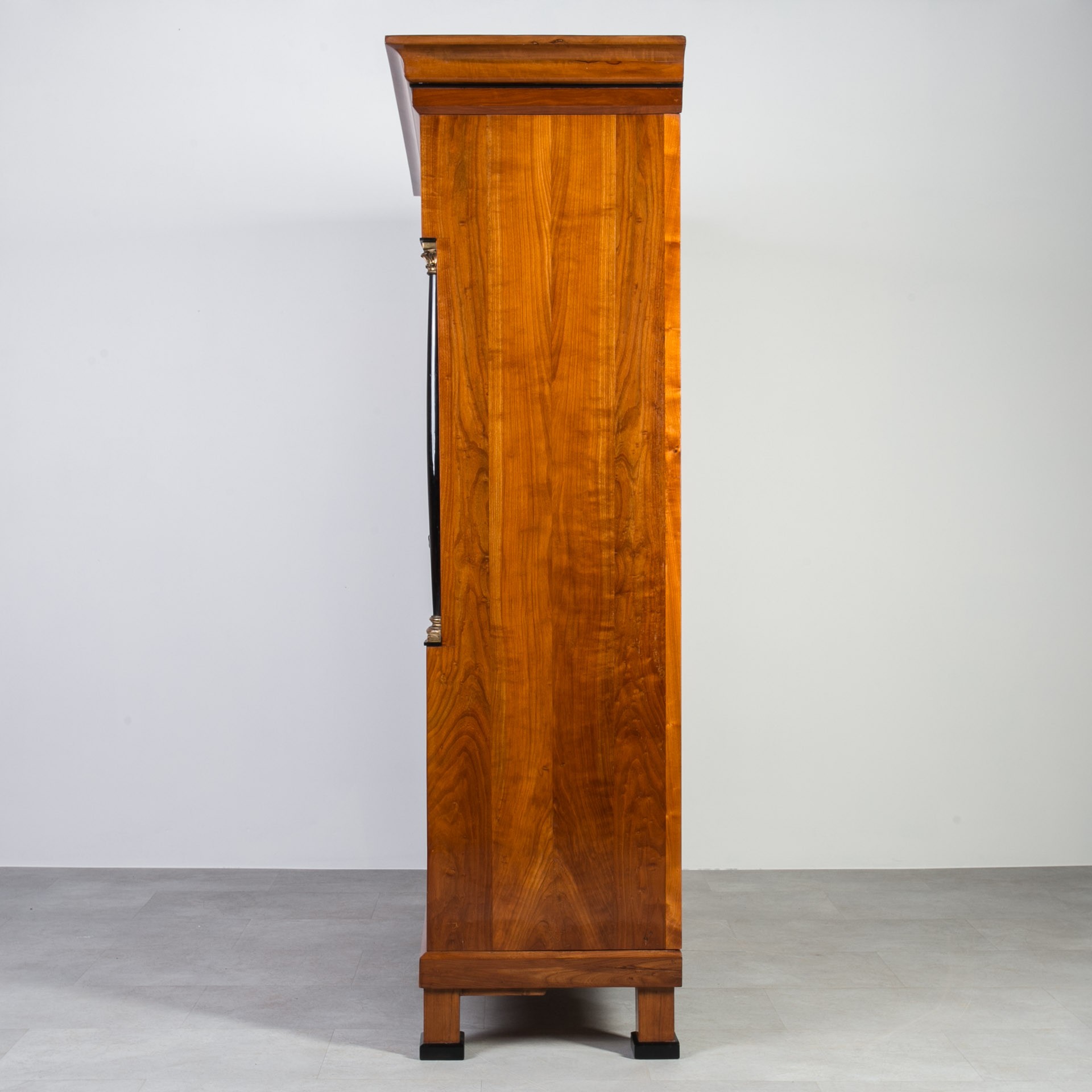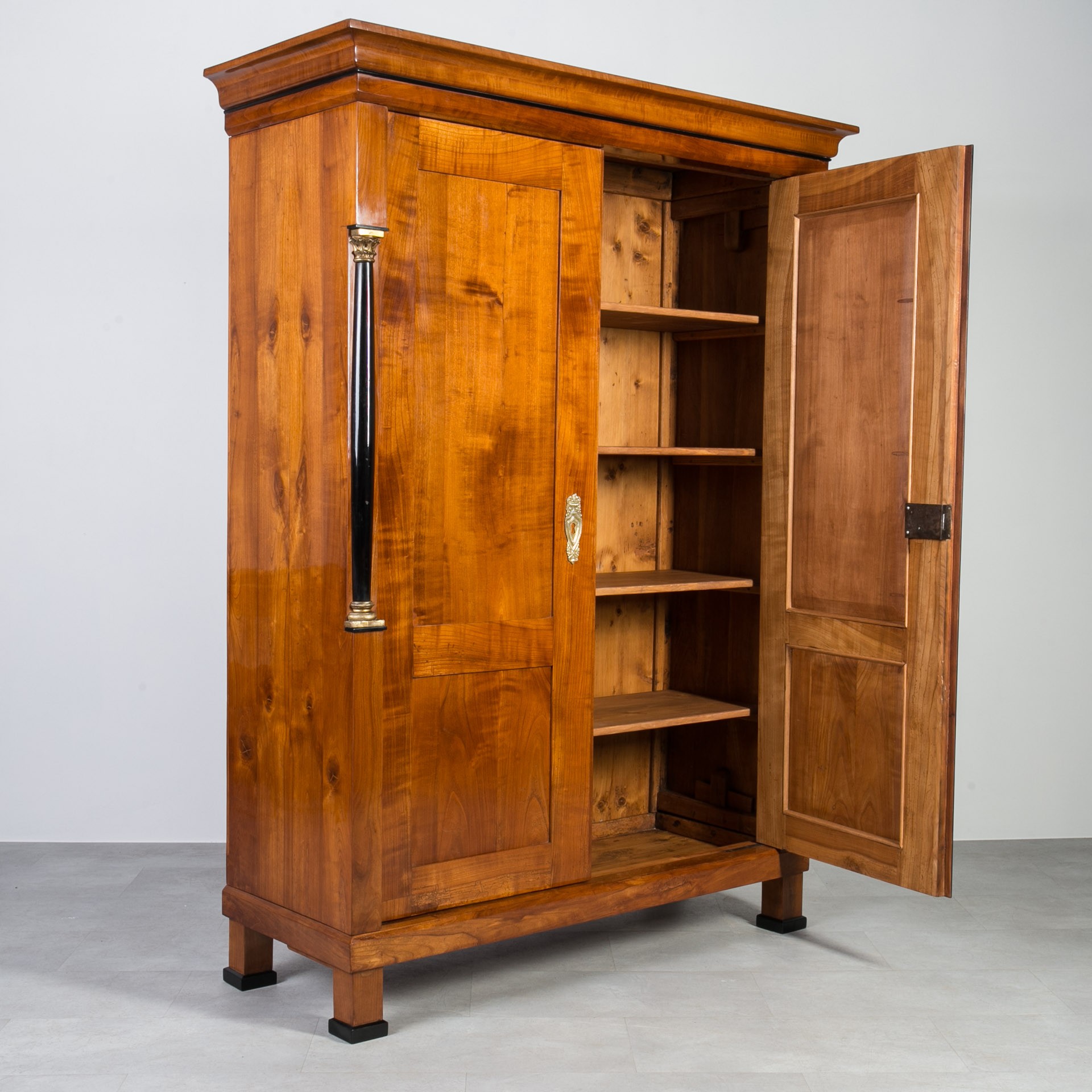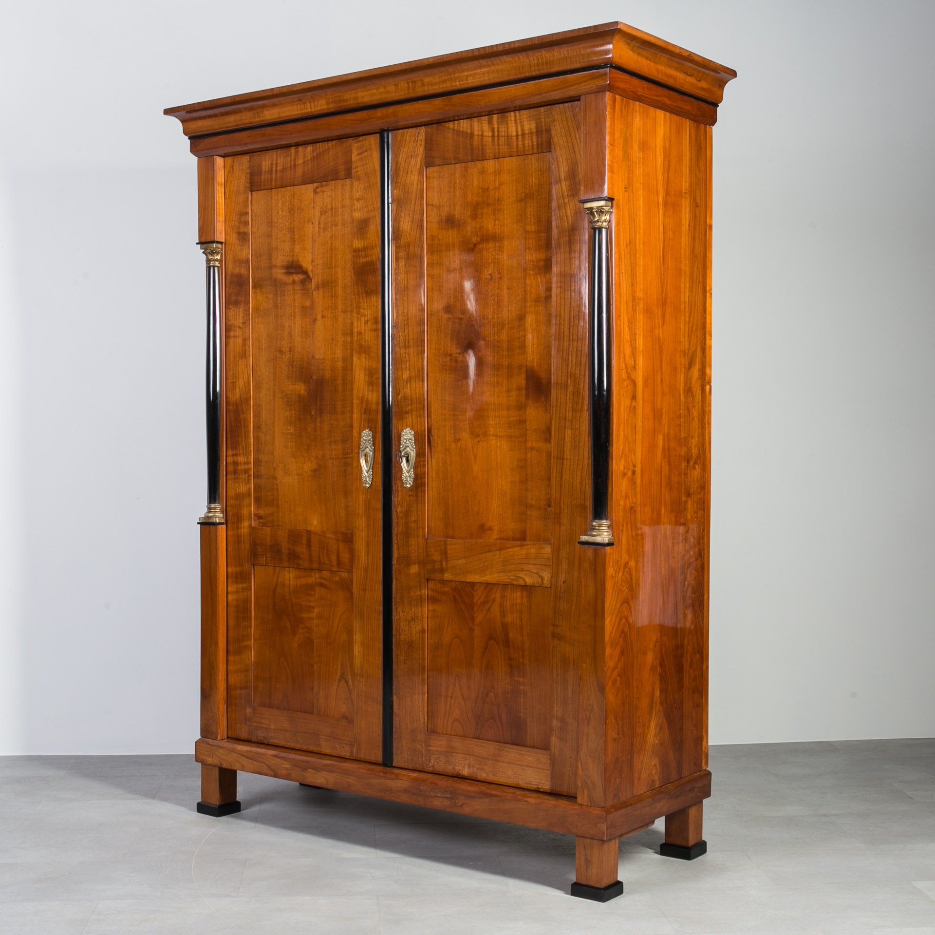 This beautiful and unique Biedermeier wardrobe, originating from Germany and crafted from solid cherry wood, dates from circa 1830–1850. It has undergone a complete and professional restoration that highlights the natural grain and warm tone of the wood. The elegant proportions and timeless design are enhanced by striking ebonized half-columns with gold-toned decorative capitals, lending the piece a refined and classical character. The wardrobe is fully dismountable and assembled using traditional wooden wedge joints, a hallmark of skilled craftsmanship that also makes transport and reassembly easy. Inside, it features four spacious shelves, making it perfectly suited for daily use. This timeless piece is a perfect fit for both refined private interiors and sophisticated commercial spaces.